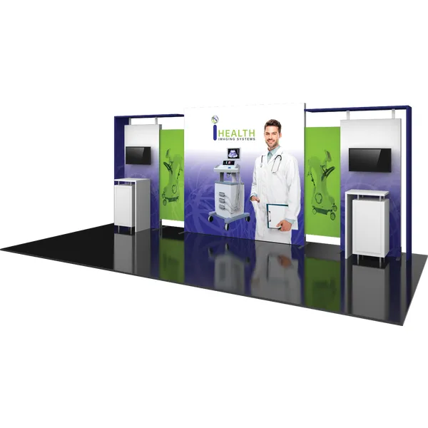 Modular Kit 11 is an ideal 10ft x 20ft display solution with a fully custom appearance. Kit 11 combines sturdy aluminum frames, custom SEG graphics and monitor mounts with backwall counters with locking storage for a modern and functional appearance. A large, central illuminated graphic panel is ideal for making any messaging stand out on the show floor. Kit 11 is reconfigurable into 10ft x 10ft Kit 03, increasing the amount of booth spaces in which the display can be used.