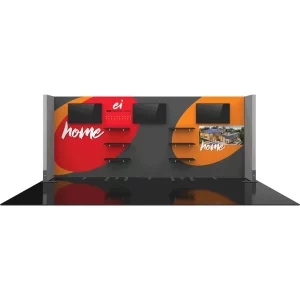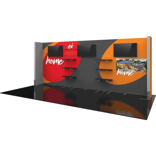 Modular Kit 22 is a 20′ inline modular exhibit with lots of bells and whistles. The center wall accommodates up to three medium to large size monitors for multimedia display. Six shelves hold small products for demonstration and display. The sidewalls add privacy and include graphics that face inside and outside of the booth, adding additional real estate for branding and messaging. Create an impact with this impressive 20′ inline exhibit!
