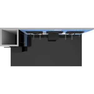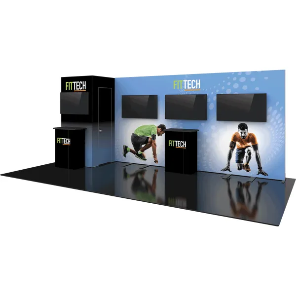 Modular Kit 25 is unique modular exhibit that offers ample backwall space for multimedia display and graphic messaging. This 20′ inline exhibit includes a locked storage closet on the left hand side, which is ideal for storing giveaways, prizes, collateral and booth staff belongings. The backwall display counters works well with monitors placed above for reception and demonstrations. This exhibit kit has it all! Push-fit SEG fabric graphics are coupled with extrusion frames for a seamless, sleek look.