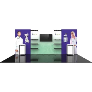 Modular Kit 31 is a functional, fashionable modular exhibit that will turn heads at your next tradeshow. Kit 31 features five push-fit fabric backwalls. The center wall includes a monitor mount that can hold a medium monitor. Two of the backwalls feature three black shelves to display small products; canopies above include puck lights designed to shine light on products below. The right and left walls are areas for bold graphics and messaging; accent counters offer areas for reception and engagement. This inline modular exhibit has a little bit of everything for the ultimate tradeshow experience!