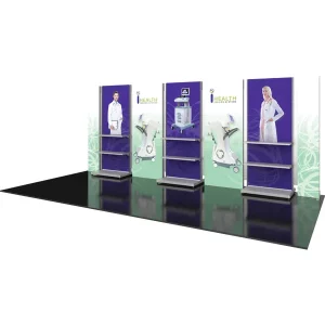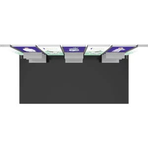 Modular Kit 37 is a bright, bold and beautiful 20ft display. It features four Blaze™ Light Boxes – one on each end and one on each side of the center. Three panels incorporate MODify™ merchandising walls and shelving for product display and presentation. Each section has SEG push-fit fabric graphics for branding and messaging; graphics are extremely easy to swap and replace. This versatile single-sided display can be used for exhibits and for retail stores!
