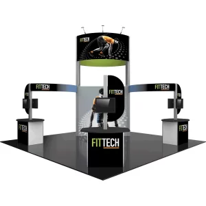 Modular Kit 17 is a striking 20ft x 20ft island exhibit, perfect for the serious exhibitor. Kit 17 features a heavy-duty aluminum extrusion frame coupled with seamless push-fit SEG fabric graphics. A 15′ 9″ central tower structure broadcasts your brand across the show floor, and two curved side arms provide additional room for displaying messaging. A trio of kiosks combining dual monitor mounts, rigid display panels and counters with locking storage provide additional room for messaging, functionality and storage. LED display lighting atop the central tower illuminates messaging for a clear display.