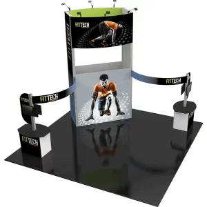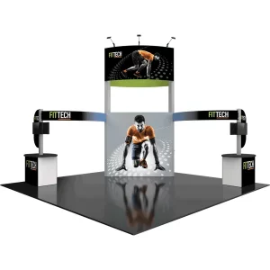 Modular Kit 17B is a striking 20ft x 20ft island exhibit that allows your brand to be seen up high without a rigging requirement. Kit 17B features a heavy-duty aluminum extrusion frame coupled with seamless push-fit SEG fabric graphics. A 15′ 9″ central tower structure broadcasts your brand across the show floor, and two curved side arms provide additional room for displaying messaging. Two connected kiosks combining dual monitor mounts, rigid display panels and counters with locking storage provide additional room for messaging, functionality and storage. LED display lighting atop the central tower illuminates messaging for a clear display.
