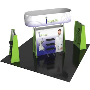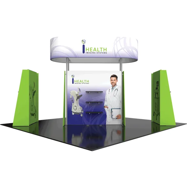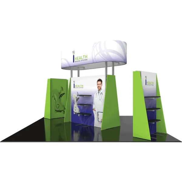 Modular Kit 29 is a modular 20ft x 20ft island exhibit kit that offers a plethora of features and a modern appearance. The center floor-based display is nearly 8ft tall and 8ft wide and includes three shelves on each side. A lockable door on the side of the center structure allows for accessible and secure storage. Triangular shaped fabric side walls offer a modern, angular look. Fabric graphics on the center structure are a combination of pillowcase fabric graphics (on the triangular side walls) and push-fit fabric graphics on the center walls. Two kiosks are included, which are similar in construction to the center display. Both kiosks offer four sides for graphic messaging, as well as three shelves for small product display. Last but not least, a lightweight pill-shaped fabric structure caps the display for ample branding above eye level. No rigging required!