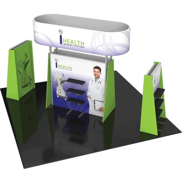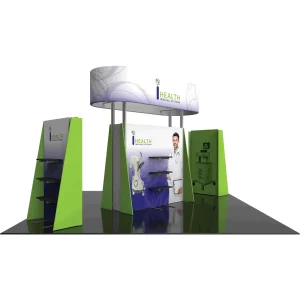 – Each kiosk includes four walls, two pillowcase fabric graphics and two push-fit fabric graphics, and three shelves for product display