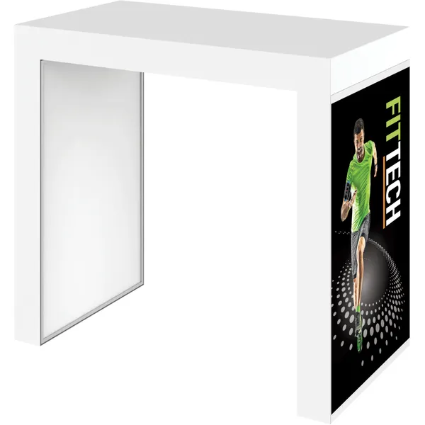 The Hybrid Pro Modular Counter 17 is a bright and clever counter! It features backlit SEG graphics on both sides, making your brand and message glow! The counter has a wood top, light box frames with SEG graphics on both the left and right sides and it packs down easy to ship quick!