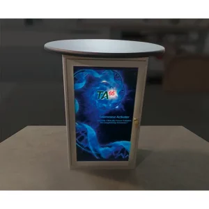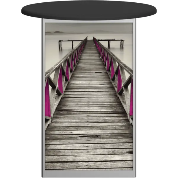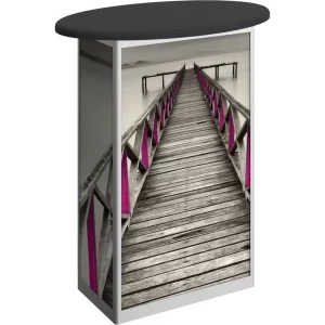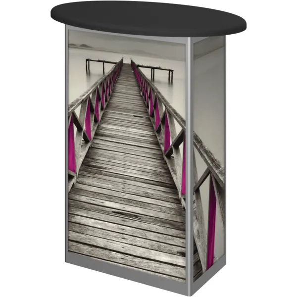 Combining durable, lightweight extrusion with printed graphic panels, Linear Oval Counter features a rectangular frame with an oval countertop, locking door and internal shelving. Choose from four countertop finish options.