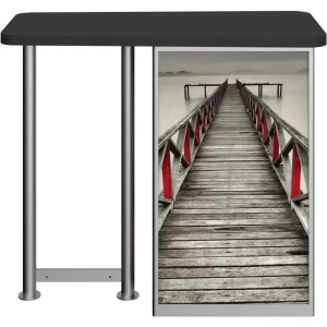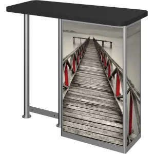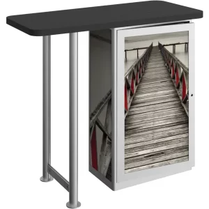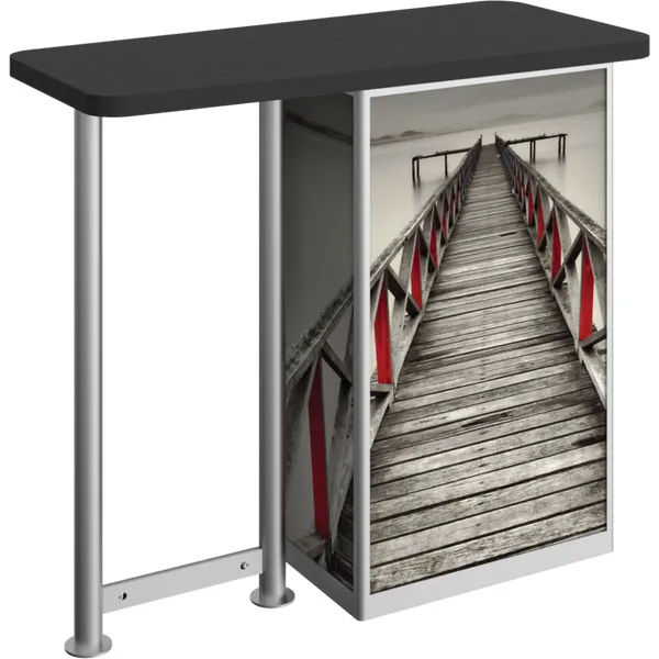 Combining durable, lightweight extrusion with printed graphic panels, Linear Straight-Leg Counter features a double-wide countertop, cabinet with locking door and internal shelving and accent aluminum straight legs.