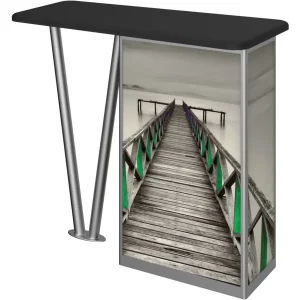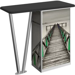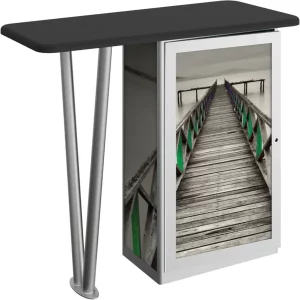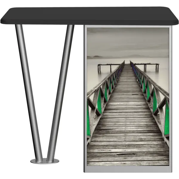Combining durable, lightweight extrusion with printed graphic panels, Linear V-Leg Counter features an “V” shaped leg complementing a rectangular cabinet column, internal shelving and locking cabinet door.